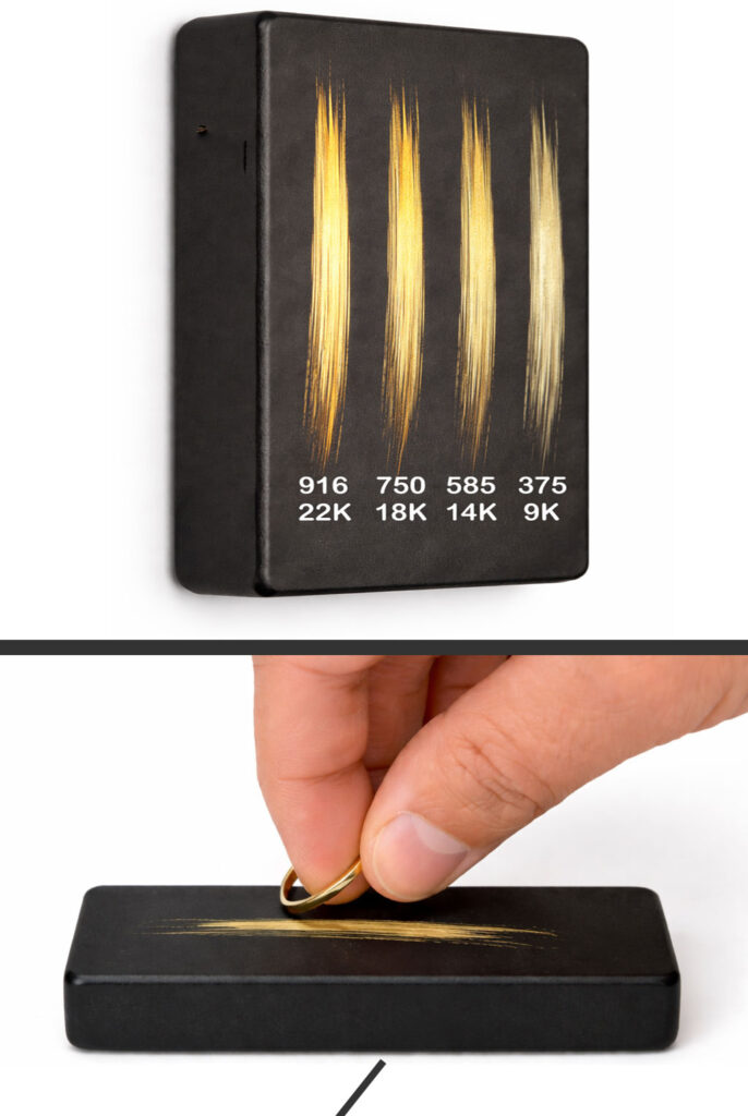 Do it yourself: Take a piece of gold with known purity (e.g., 916 gold) and draw a straight line on a touchstone. Then draw a line with the gold you want to test. If both lines appear similar in color, the tested gold may have similar purity (916).